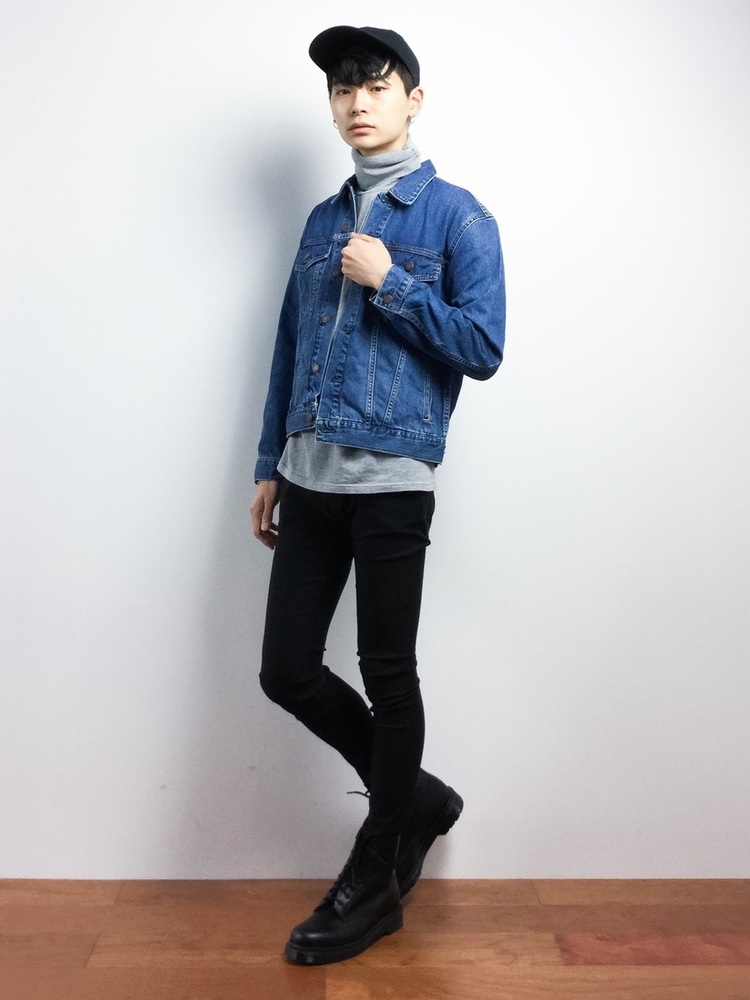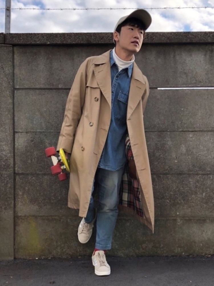 カジュアルなデニムオンデニムのメンズコーデに、あえてきれいめアイテムである白のタートルネックとトレンチコートを合わせることで着こなしに大人っぽさを加えています。ベージュとブルーの反対色を組み合わせた、メリハリのある配色がポイント。デニムの裾から覗く赤のソックスがアクセントです。