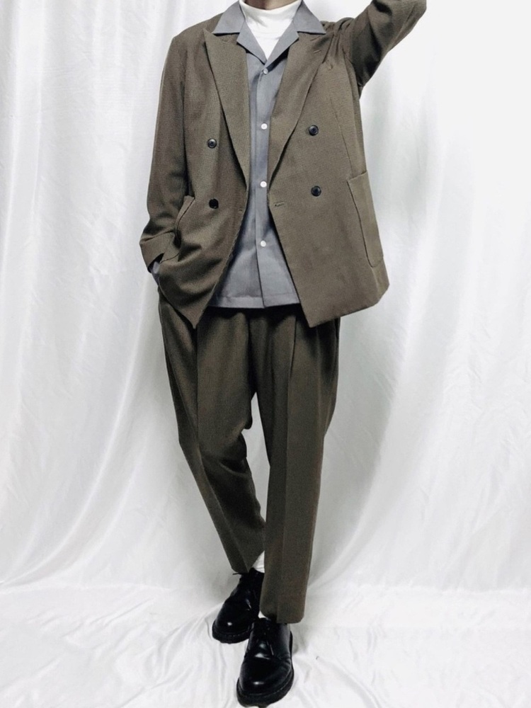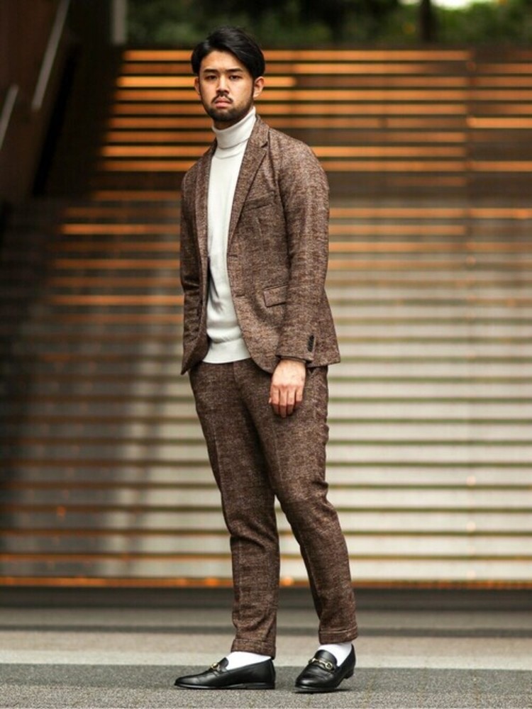 タートルネックにオープンカラーシャツを重ね着し、カジュアルダウンしたメンズコーデです。ジャケットとテーパードパンツのセットアップは固い印象や、単調に見えることもありますがインナーからアウターへグラデーションを作るよう着こなすと、垢抜けた着こなしに。今トレンドのくすみ系カラーを、黒のドレスシューズで引き締め好バランスを作っています。