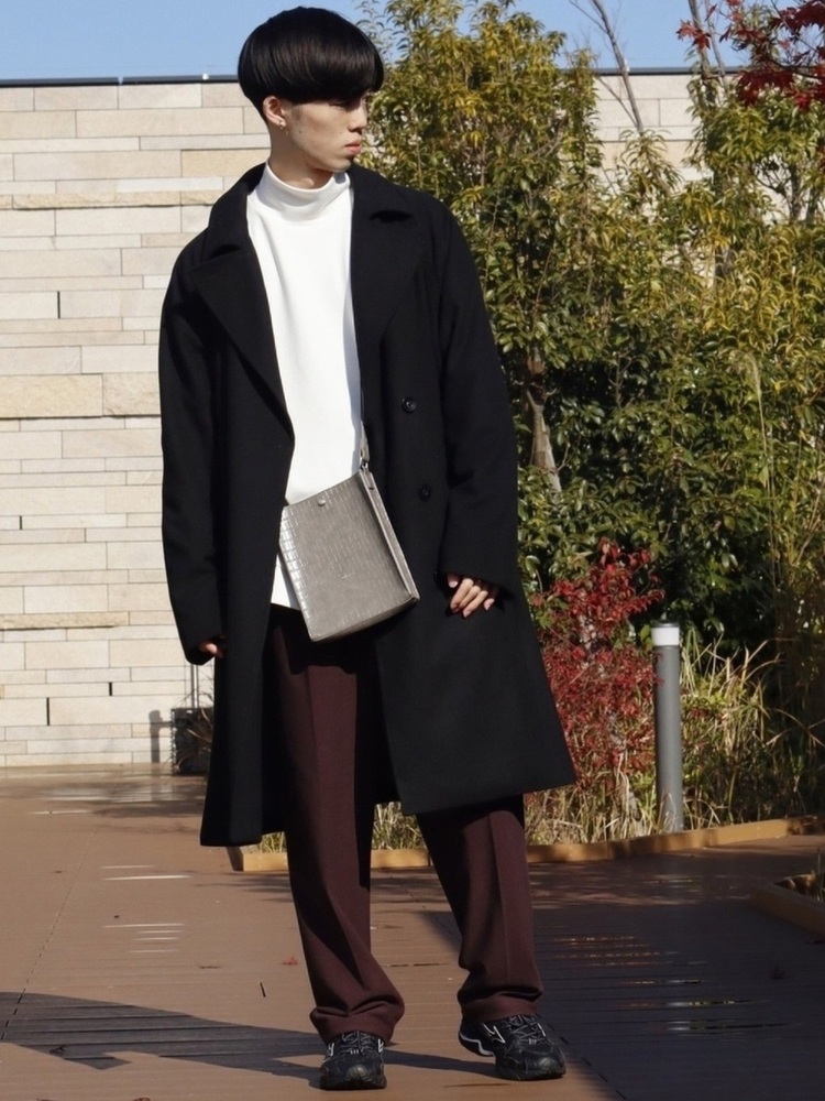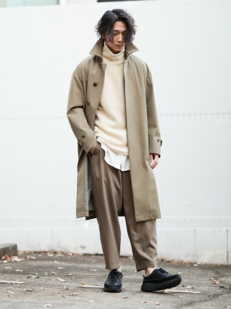 タートルネックの下にロング丈の白シャツをレイヤードさせた、堅苦しくないメンズコーデです。きれいめコーデに、あえてスニーカーやレイヤードなどでカジュアル感をプラスすることで、ベーシックな着こなしにトレンド感を足しています。アンクル丈のワイドパンツと、ステンカラーコートのバランスもお見事です。