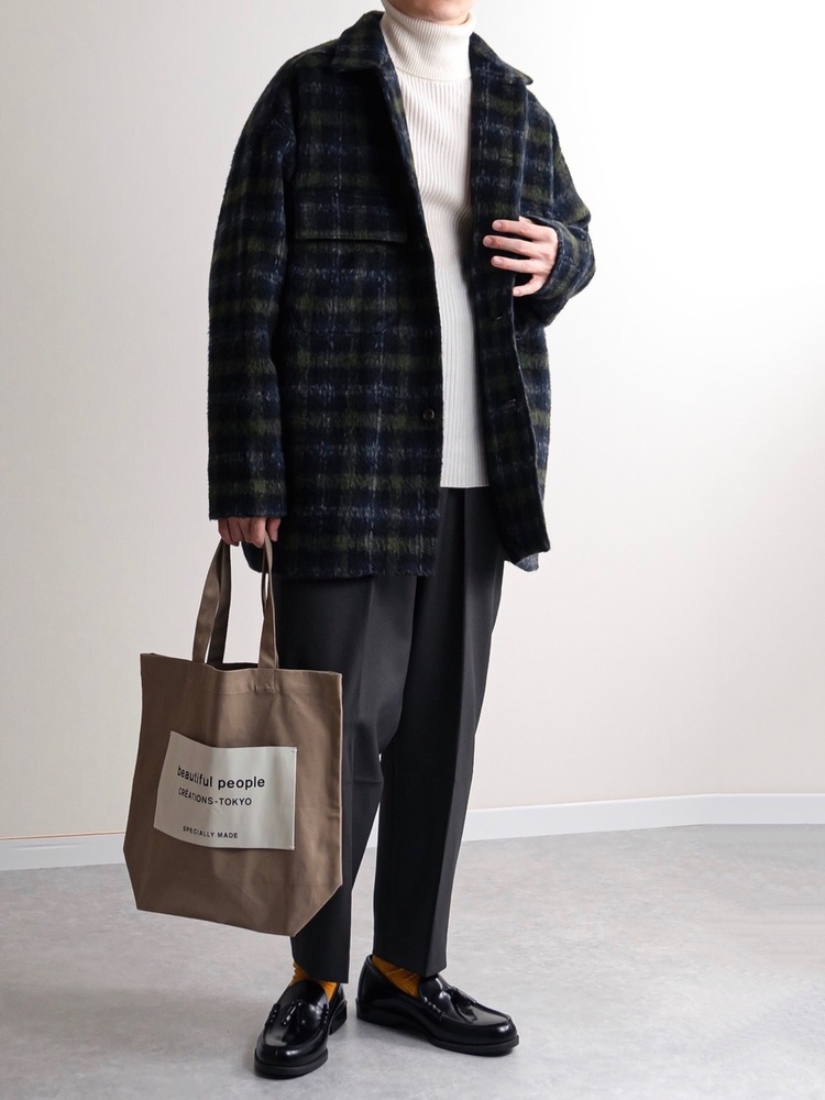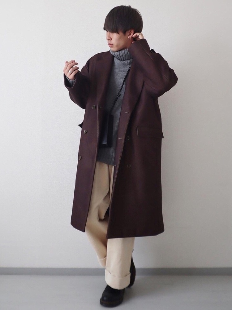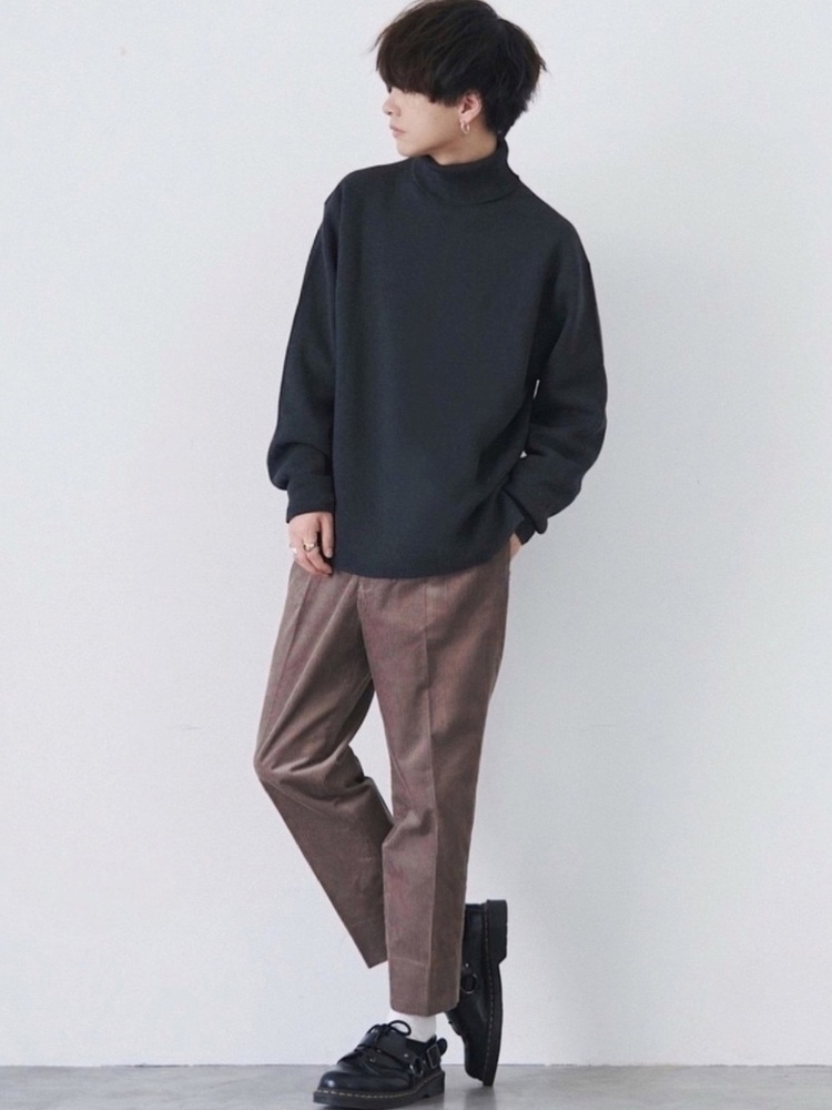 ブルータートルネック×ステンカラーコート×イージーパンツ