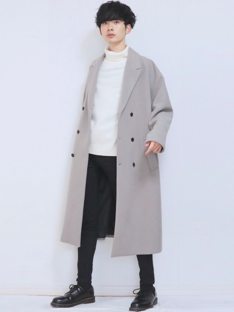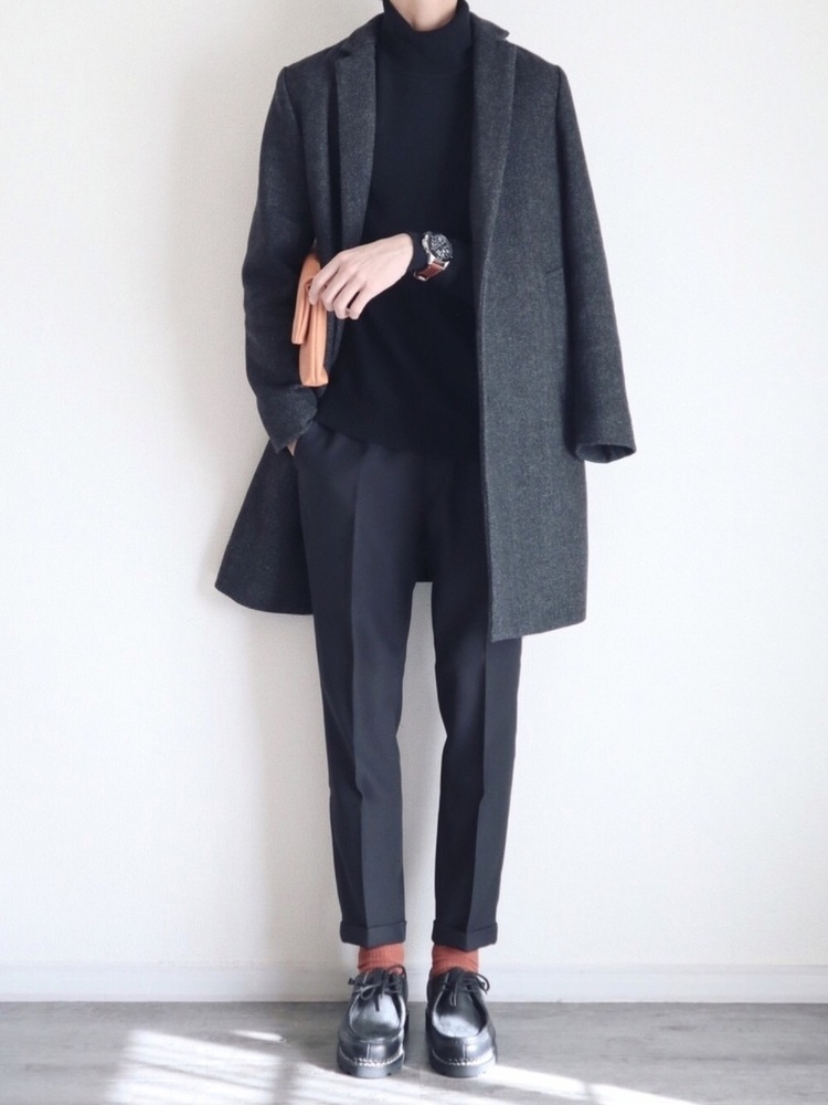 モノトーンでまとめたメンズコーデは、TPO問わない好感度の高い着こなしに仕上がります。裾が広がった膝下ロング丈のチェスターコートとスキニーパンツで、メリハリが出るAラインシルエットを形成。スキニーパンツとドレスシューズは同じ黒で統一し、脚を細く長く見せていることもポイントです。