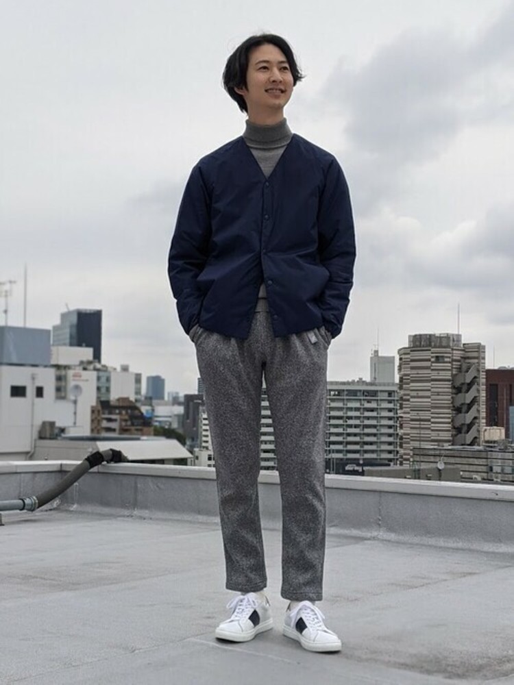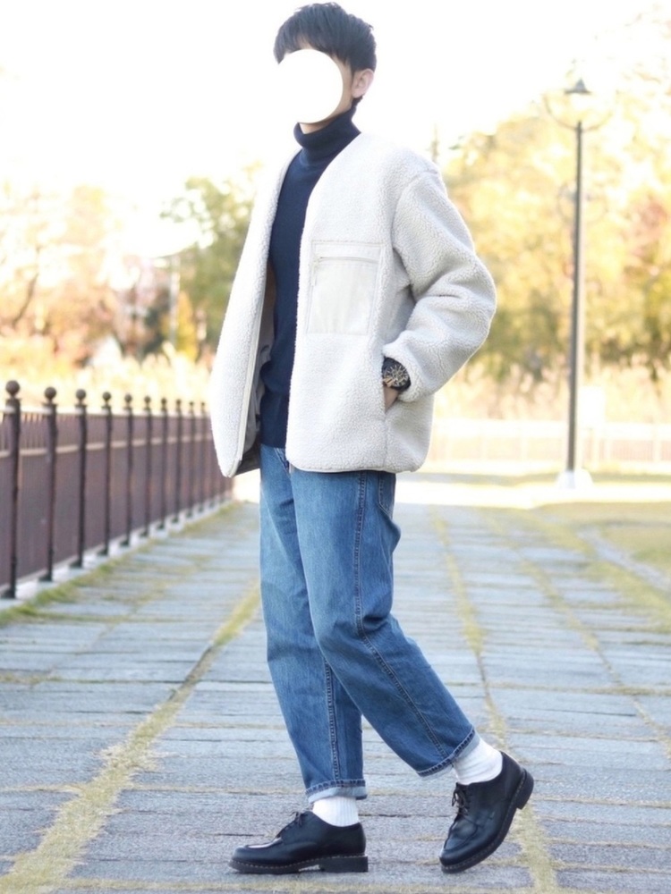 フリースカーディガンのインナーに、ダークネイビーのタートルネックを合わせたきれいめカジュアルコーデです。テーパードの効いたデニムは裾を折り、ラフな雰囲気を残すことできれいめに偏り過ぎない着こなしに仕上げています。