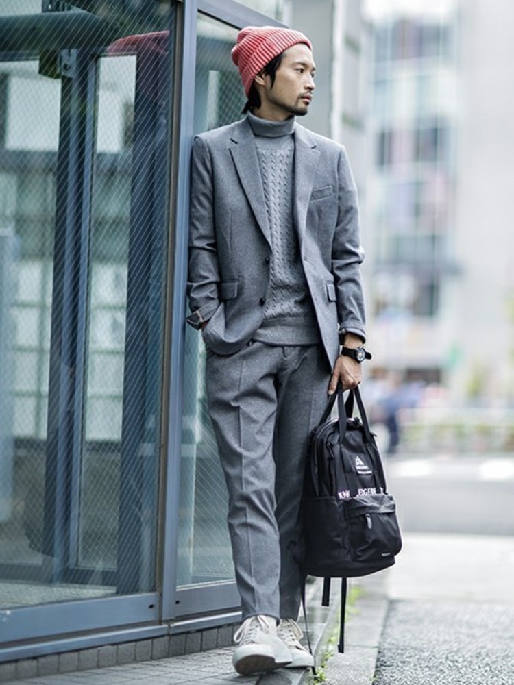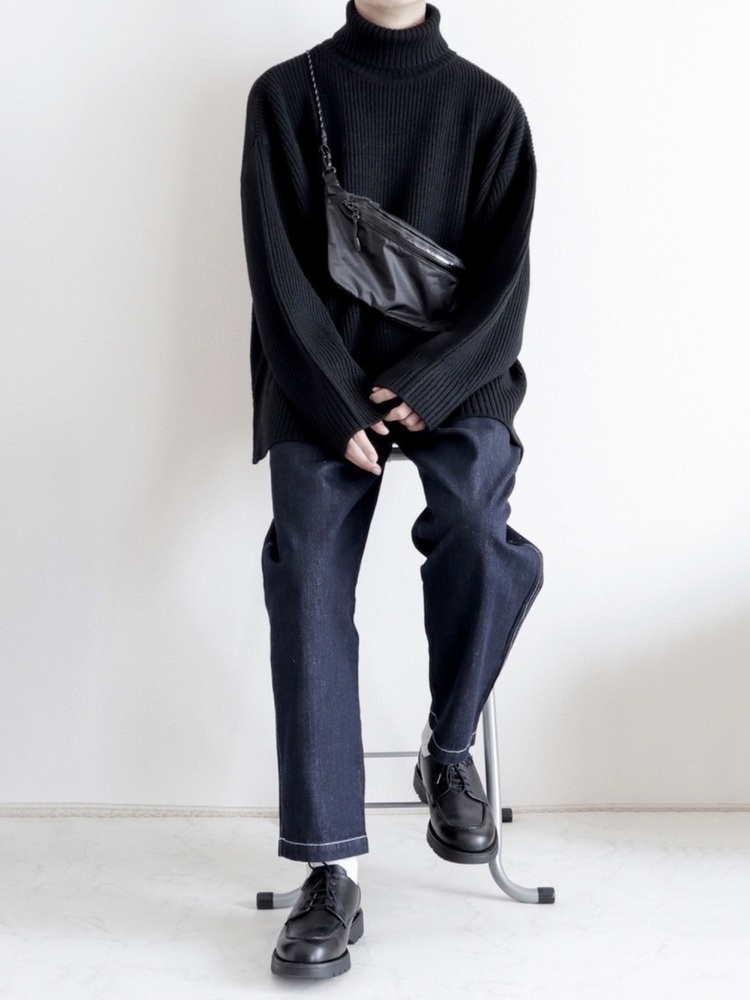ですが、アウターやボトムスなどの色味とマッチさせることにも気を配りましょう。タートルネックが赤、ボトムスがブルーなど上下が有彩色だと色合いのバランスが取れず、ダサい印象になるので注意です。