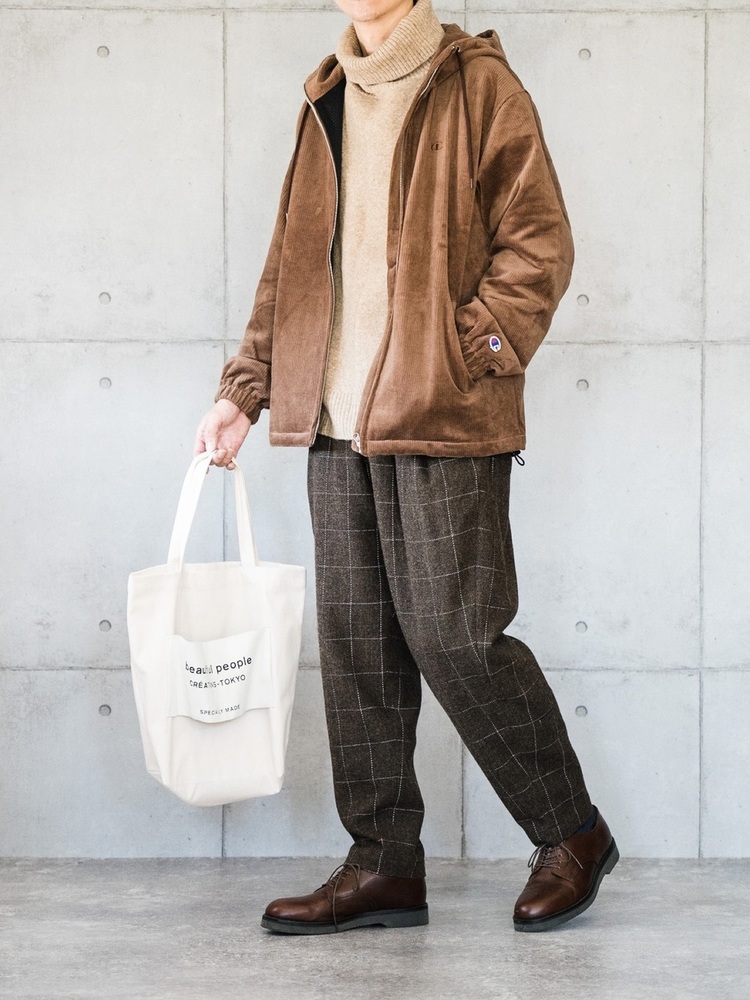 ベージュタートルネック×コーデュロイマウンテンパーカー