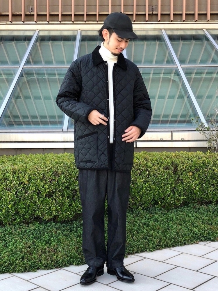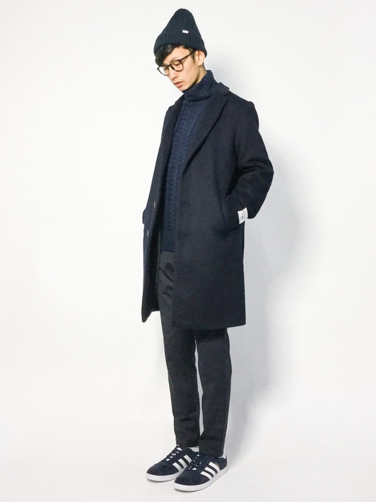 Iラインシルエットが美しいスマートコーデです。基本黒のアイテムでまとめつつ、ネイビーをインナーに入れることで沈んだ印象にならずこなれた雰囲気に。外しアイテムであるニットキャップやメガネなど、小物類も使うことでシンプルでも遊び心のある着こなしに仕上がっています。