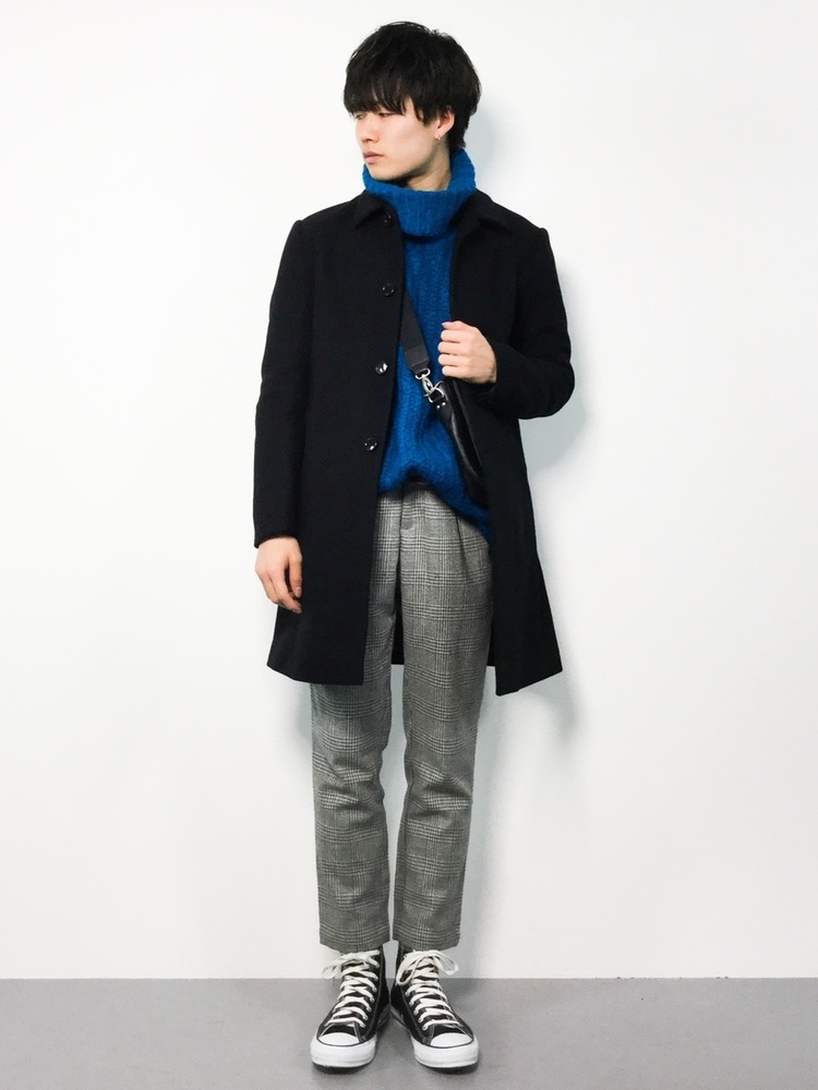 ロイヤルブルーのタートルネックは、シンプルな着こなしに存在感を与えてくれる効果があります。足元はスニーカーでカジュアルダウン。ミディアム丈のアウターと、テーパードがかかったアンクル丈のパンツですっきりとしたシルエットを作り、都会的なコーデにまとめています。