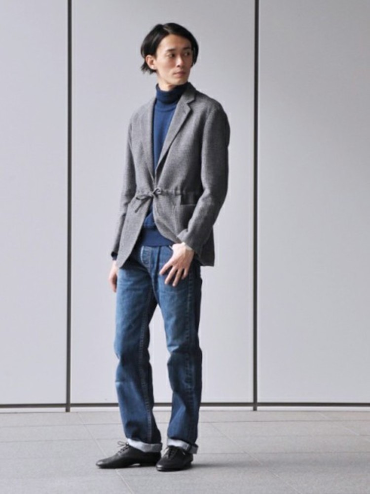 ジャケットにタートルネックを合わせるときは、ハイゲージなど生地が薄めのものを選んでください。ジャケットに厚手のタートルネックを合わせてしまうと、着膨れして太って見えてしまうので避けましょう。