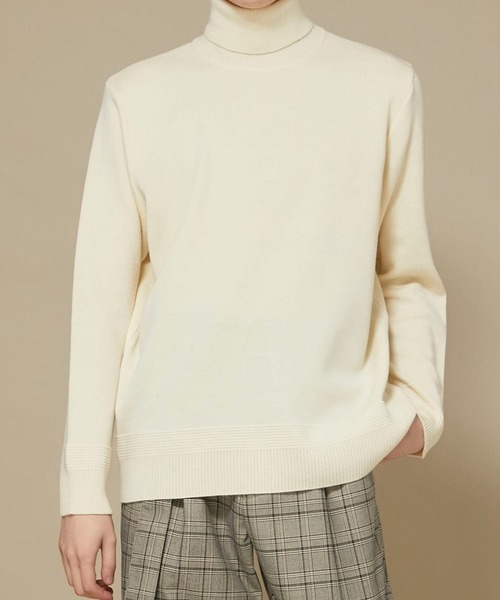 ニット本来の伸縮性を発揮させる縫い目をなくしたオールガーメント製法を採用し、首の窮屈さを軽減し着心地の良さを叶えたタートルネックです。生地は薄めなので、ジャケットなどにも合わせやすくなっています。袖口や腰部分は軽く絞られており、着るだけでシルエットにメリハリを作れることも特徴です。