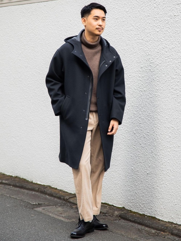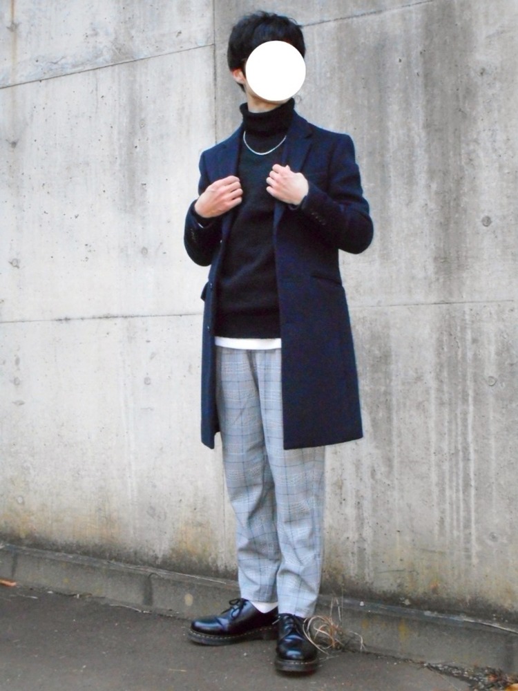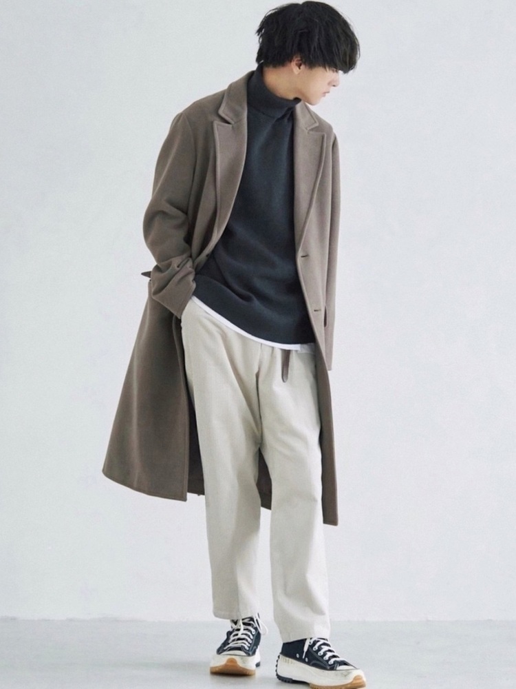 ネイビータートルネック×チェスターコート×イージーパンツ