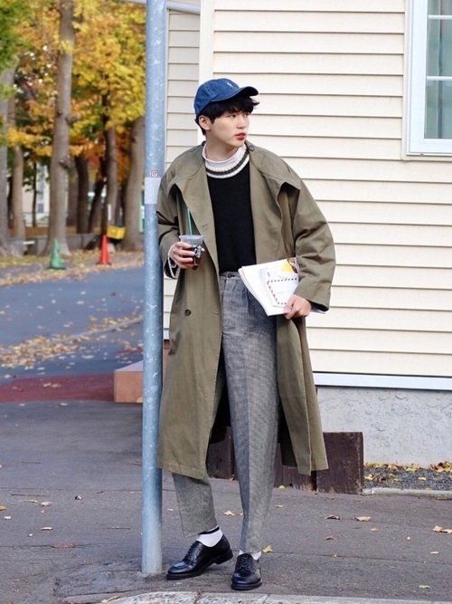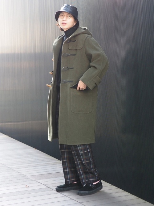 今季再注目されているダッフルコートに黒のタートルネックニットとチェックのパンツを合わせ、上品さとトレンド感のあるメンズコーデに。モスグリーンのルーズシルエットのダッフルコートが新鮮な存在感を放っています。レザーのバケットハットやストラップ付きのスリッポンがこなれ感をプラス。
