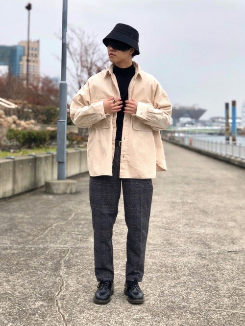 黒のモックネックセーターに白のコーデュロイCPOジャケットが映えるモノトーンコーデです。シックなグレーのチェックパンツが上品さとウォーム感を演出し、タックインで着ることでメリハリのある洗練された着こなしに。バケットハットでモードな雰囲気もプラス。