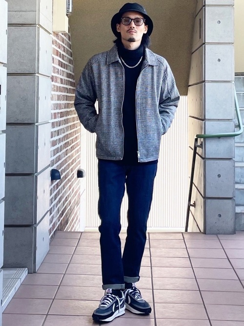 品のよさと男らしさを併せ持ったウール素材のスウィングトップに上品なタートルネックセーターを合わせたカジュアルメンズコーデです。タイトなジーンズとスニーカーで軽快な印象の着こなしに仕上がっています。バケットハットやネックレス、サングラスでこなれ感をプラス。大人らしさとカジュアル感のバランスが絶妙なコーデです。