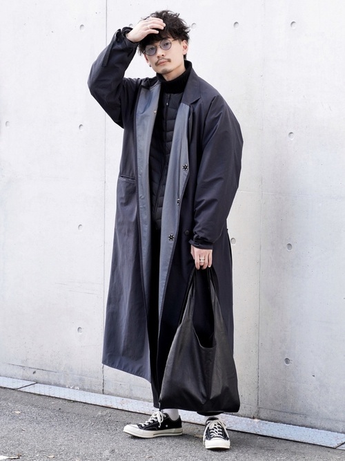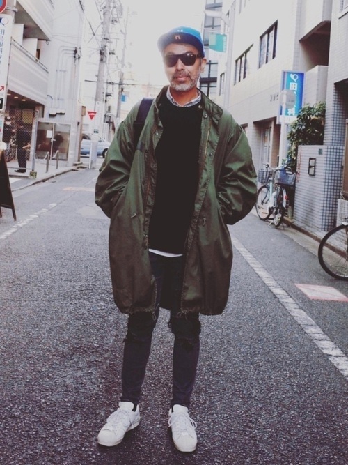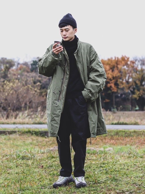 黒のワントーンコーデに、トレンド感のあるゆったりとしたサイズ感のモッズコートを羽織ったメンズコーデ。M-65のモッズコートをベースにしたミリタリー感の強いトップスに、ワークテイストのワイドジーンズを合わせてクールでタフな印象の着こなしに。スニーカーが抜け感をもたらして、黒の重さを軽減しています。
