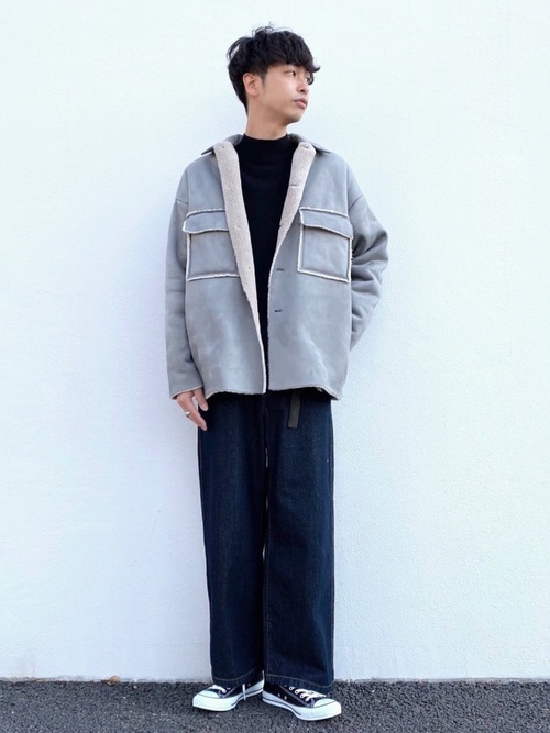 プレーンなモックネックセーターにワイドデニムパンツとグレイッシュなブルーのエコムートンジャケットを合わせたメンズコーデです。黒とブルーの相性のよいカラーリングで、ジャケットとパンツのブルーのグラデーションがさわやかです。黒のモックネックセーターが品のよさと適度なカジュアル感をもたらしています。