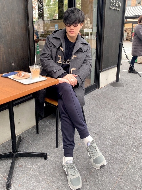 すっきりと着こなせる細身のダッフルコートに黒ニットとスウェットパンツを合わせたスタイリッシュなスポーツMIXスタイルです。ニットのロゴがさりげないアクセントになっています。足元はライトグレーのスニーカーと白のソックスで、軽快な印象に。