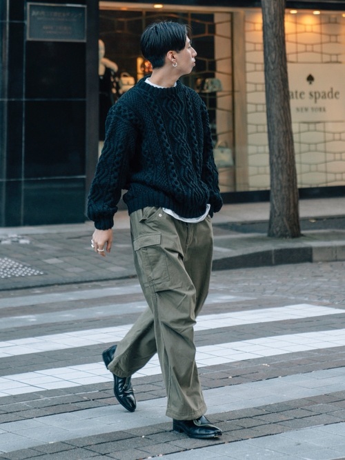 ざっくりとした黒のフィッシャーマンズニットとカーゴパンツのこなれ感とリラックス感が漂うメンズコーデ。インナーの白が効果的に抜け感をもたらしています。きれいめのシューズやシルバーのアクセサリーを合わせることで、無骨なだけではない洗練された大人のミリタリーカジュアルに仕上がっています。