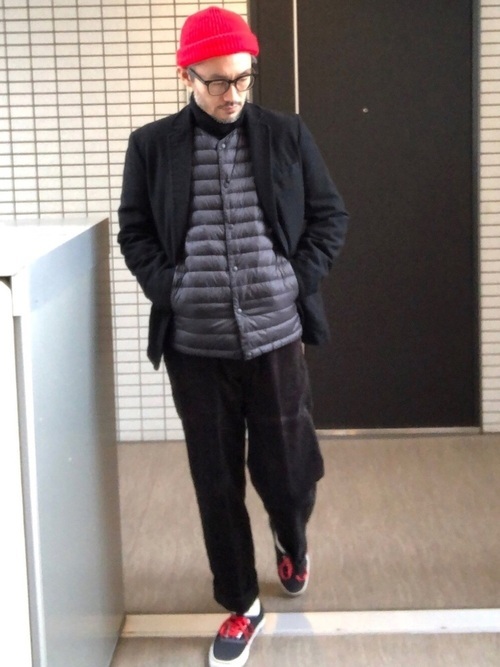 黒のテーラードジャケットをインナーダウンやワークパンツなどでカジュアルダウンしたメンズコーデ。ニットキャップとスニーカーの赤が効いています。インナーに上品なタートルネックセーターを着ることで、きれいめ要素とカジュアル感が好バランスに。大人ならではのこなれ感のあるスポーツMIXスタイルに仕上がっています。