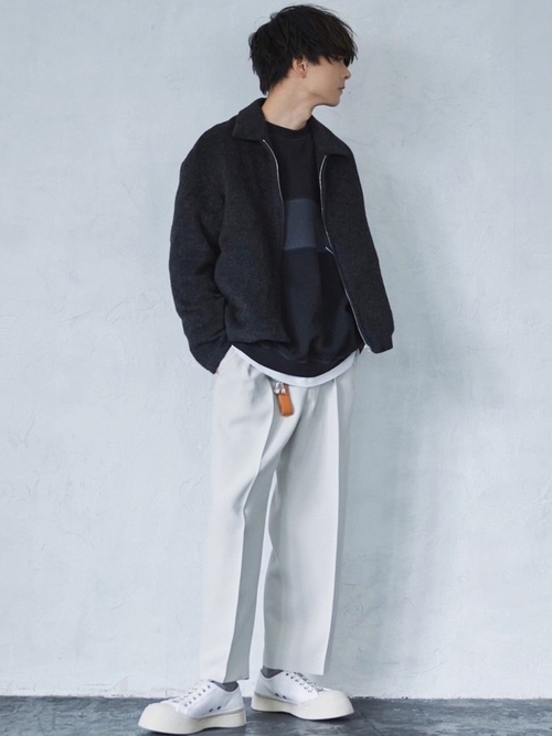 黒ニット×黒ブルゾン×白Tシャツ×白パンツ