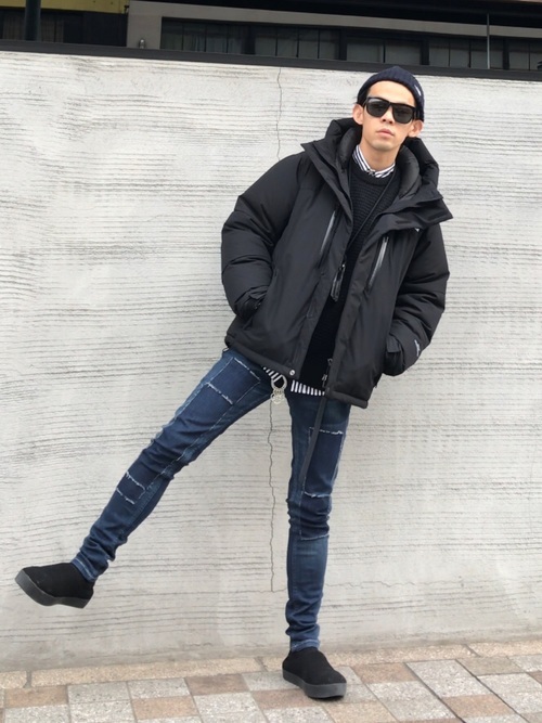 黒ニットにパッチワーク加工を施したスキニージーンズを合わせたメンズコーデです。ボリュームのあるバルトロジャケットを羽織って、バランスのよいYラインコーデに。ジーンズの程よいカジュアル感がアクセントになり、黒の重さを払拭しています。
