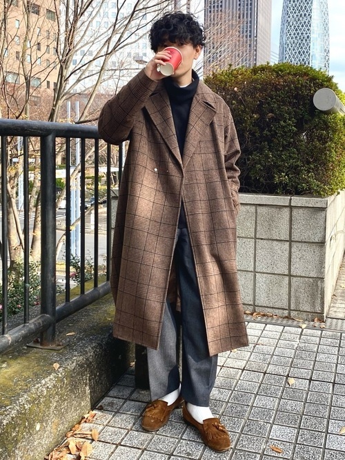 黒ニットがコートのトラッドなチェック柄を引き立てるメンズコーデです。オーバーサイズのチェスターコートとゆったりとしたスラックスで旬のシルエットに。足元もブラウンで合わせることで、季節感のあるシックな着こなしに仕上がっています。