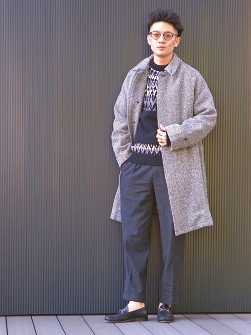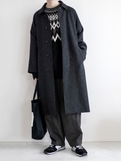 黒のノルディック柄のクルーネックセーターとシックなグレーのコートとスラックスを合わせた大人カジュアル。モノトーンコーデですが、柄ニットで抜け感が、濃淡のあるアウターとボトムスでメリハリが生まれ、奥行きのある着こなしになっています。