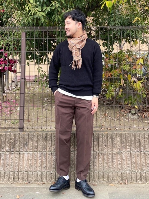 ジャストサイズの黒ニットにブラウンのボトムスを合わせた、シンプルなきれいめカジュアルコーデ。温かみのあるオレンジのコンパクトなマフラーがアクセントになっています。インナーとソックスに白を配置して、抜け感もばっちり。ニットは機能素材のソロテックスなので、秋冬春の3シーズン活躍します。