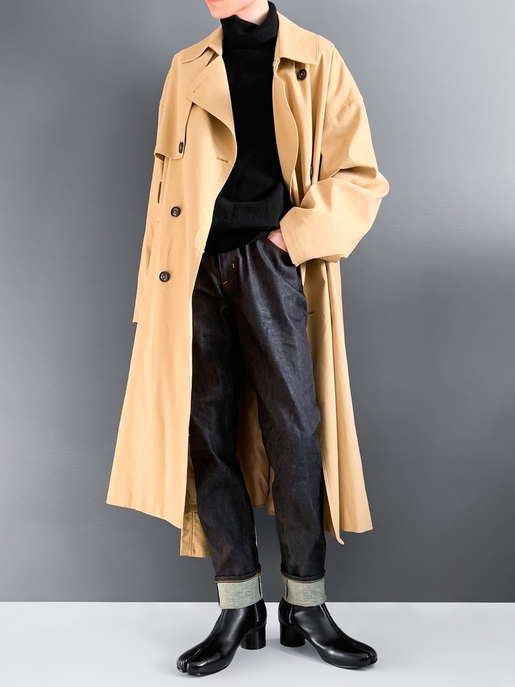 黒ニット×ベージュトレンチコート×ベージュスラックス