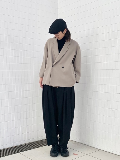 ベージュのジャケット以外を黒でまとめたスタイリッシュなメンズコーデです。ベージュのビッグジャケットとデザイン性の高いパンプキンパンツで、モダンなシルエットに。黒のタートルネックがより品のある着こなしに仕上げています。