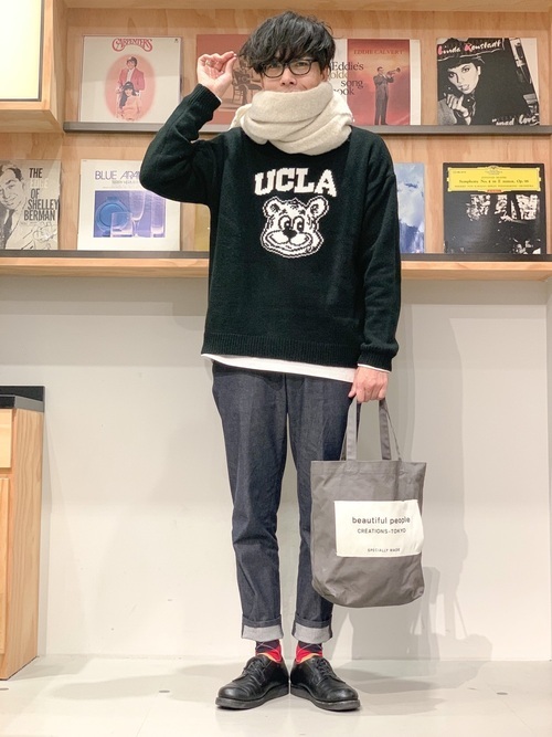 可愛らしいクマのニットも、きれいめのジーンズを合わせれば大人のきれいめカジュアルに。インディゴブルーのデニムスラックスをロールアップして軽快さを出し、アーガイルソックスで色味をプラス。インナーに白を挟むことでメリハリの効いた着こなしになっています。