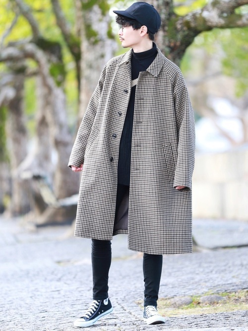 コート以外のアイテムを黒に統一することによって、コートの上品なガンクラブチェック柄とAラインのシルエットが引き立っています。レディースのスキニージーンズですっきりとしたシルエットになり、スマートな着こなしになっています。チルデンニットとスニーカーの白がアクセントに。キャップのハズしも効いています。