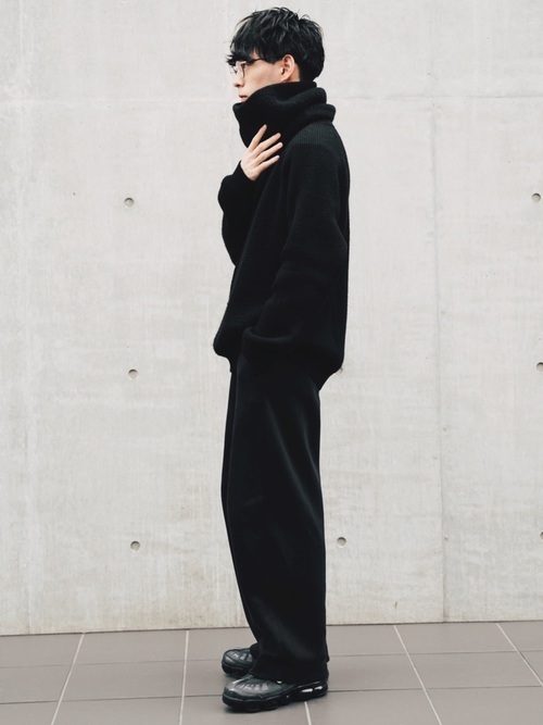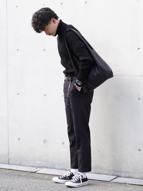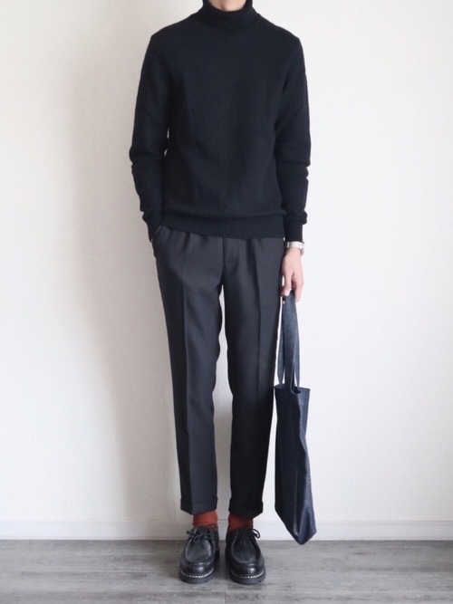 黒のタートルネックニットとクラシカルな黒のテーパードパンツのブラックコーデです。すっきりとしたシルエットのなので、オールブラックでも重さを感じさせず、スマートな着こなしになっています。ソックスの差し色が程よいアクセントに。