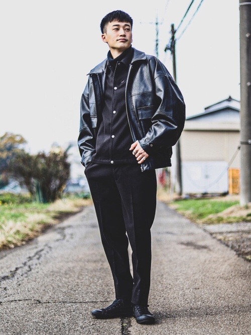 黒ニットとセットアップのレイヤードにレザージャケットを羽織ったオールブラックコーデ。レザージャケットの素材感がアクセントになるので、オールブラックでもメリハリのあるコーデになります。黒ニットがバランスを整えて、モダンな印象に。