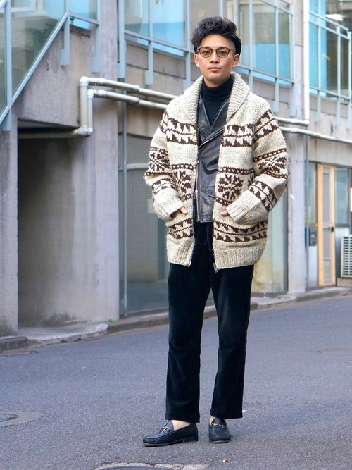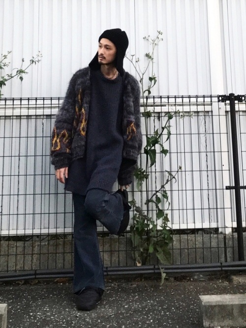 長め丈の黒ニットのアウターに、絣染めの糸を用いたファイアーパターンが印象的なニットカーディガンを着用した古着MIXコーデ。ベルボトムのジーンズやニットのフライトキャップ、ボリューミーなスリッポンなどの個性的なアイテムを使っていますが、黒で統一してモードな着こなしに。カーディガンもコーデに馴染みつつ、存在感を発揮しています。