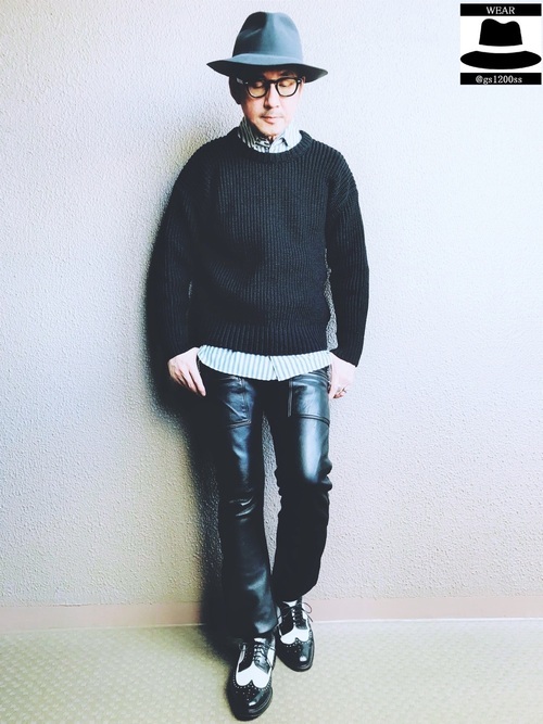 黒のクルーネックセーターにストライプシャツと革パンを合わせたシンプルなアメカジスタイルです。上質でベーシックな黒ニットとストライプシャツを合わせることで、革パンのハードな印象が緩和され、大人らしいスマートなアメカジスタイルになっています。モノトーンとブルーのシンプルな配色もポイントです。