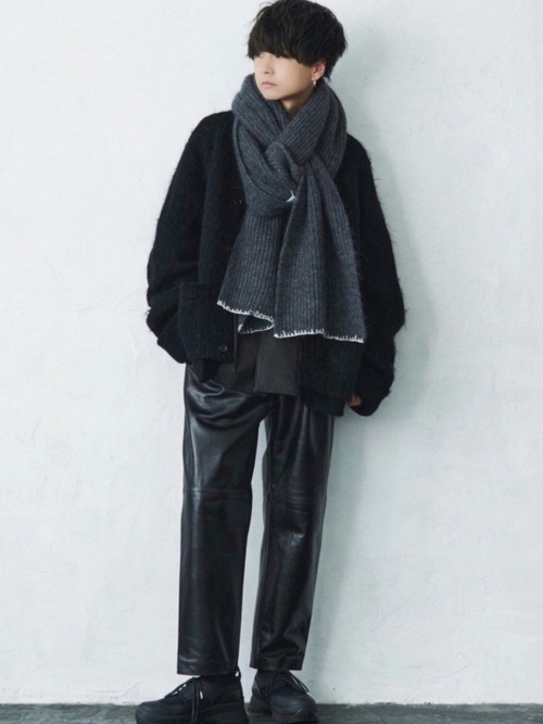 レザーアイテムは、ニットと同じ黒がおすすめです。他のカラーだと、チグハグな印象になってしまったり、黒ニットの洗練された雰囲気が損なわれてしまう可能性があるので、注意が必要です。また、アウターもボトムスも両方ともレザーにしてしまうとハード過ぎるコーデになってしまうので、バイクに乗る場合以外はおすすめできません。