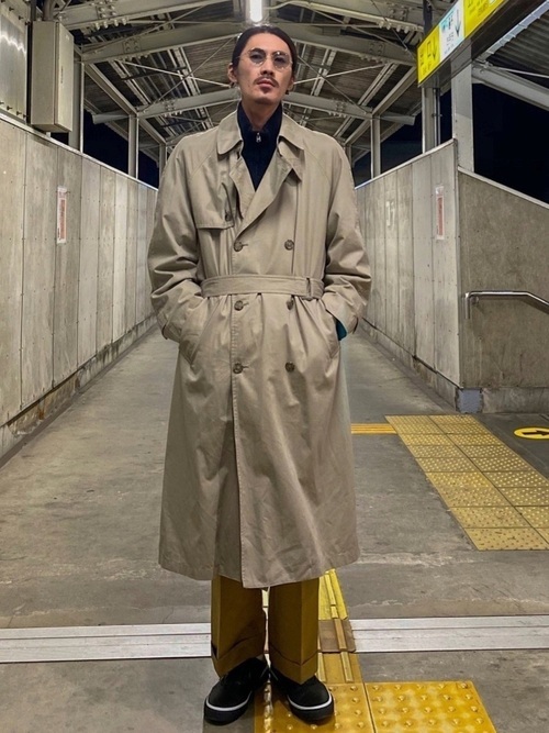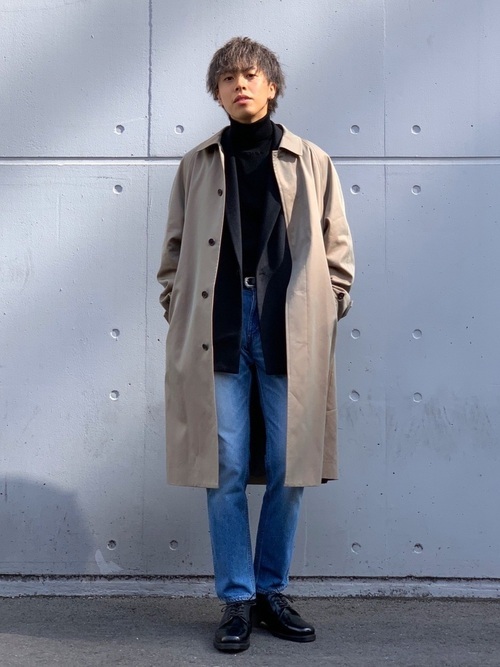 トレンチコートとスラックスのオーセンティックな組み合わせに、ハーフジップの黒のセーターとスニーカーでスポーティさを加味したメンズコーデです。セーターとスニーカーがアクセントになり、こなれ感のあるきれいめコーデに仕上がっています。トレンチコートのベルトを締めることで、メリハリのあるスマートな着こなしになっています。