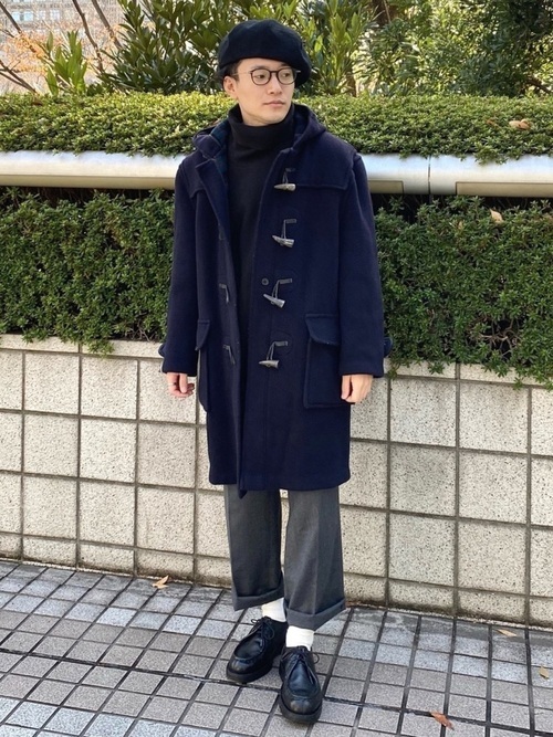 トラッド感とミリタリーならではのラフな雰囲気をあわせ持ったダッフルコート。ともすると野暮ったくなりがちなアイテムですが、黒のハイネックニットとロールアップしたスラックス、小物使いの効果で、シンプルながらもあか抜け感のある着こなしに仕上がっています。ソックスを見せて抜け感を作るのもポイントです。