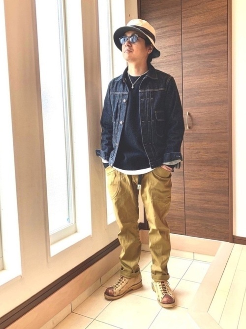 黒ニットにGジャンとベージュのイージーパンツを合わせたアメカジスタイルです。程よいサイズ感の濃紺のGジャンと細身のシルエットのパンツで、リラックス感のあるきれいめな印象のアメカジスタイルに仕上がっています。白のインナーでメリハリも効いています。