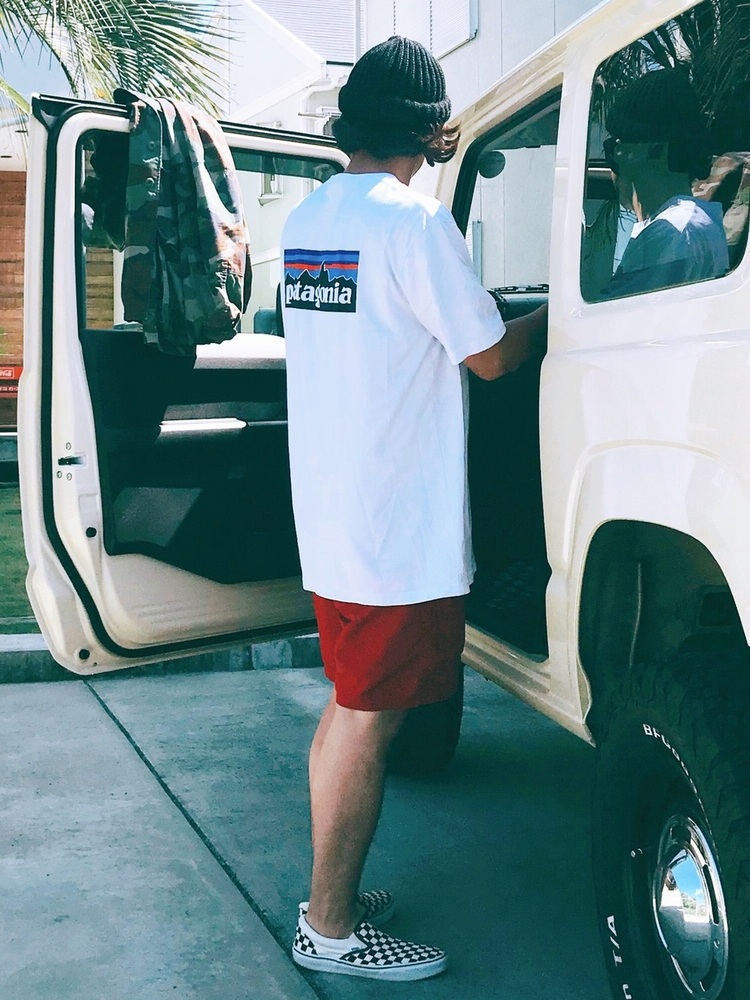 パタゴニアのバギーズショーツにTシャツ、ニット帽を組み合わせたメンズコーデ。はっきりとした赤色が映えるコーディネートです。ニット帽と組み合わせることで普段着としてのおしゃれ感が強まるのでおすすめです。ラフなおしゃ着を楽しみたい方は真似してみてくださいね。