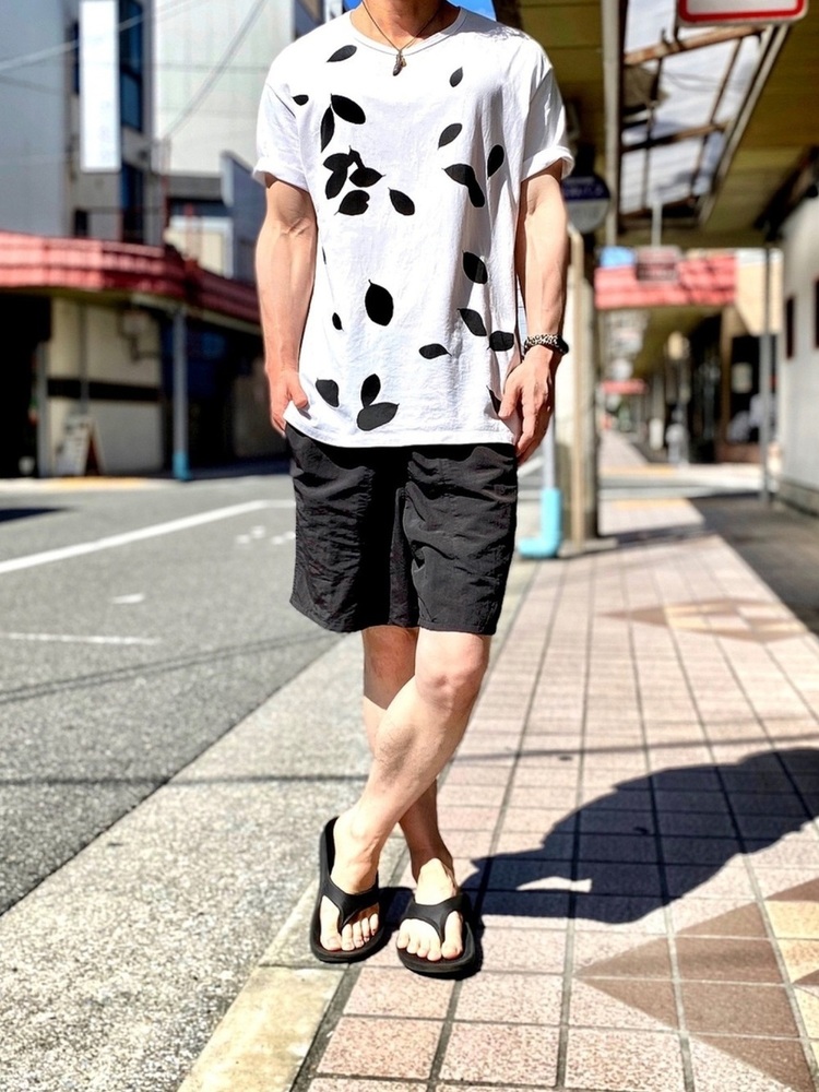 白と黒のみで統一感のあるコーディネートです。暑い夏の日でもシンプルでおしゃれにかっこよく仕上がります。黒いサンダルにすることで、ラフな雰囲気も演出できるメンズコーデ。着用しているバギーズロングは少し長めの丈なので、短すぎる丈感に抵抗がある人でも問題ありません。