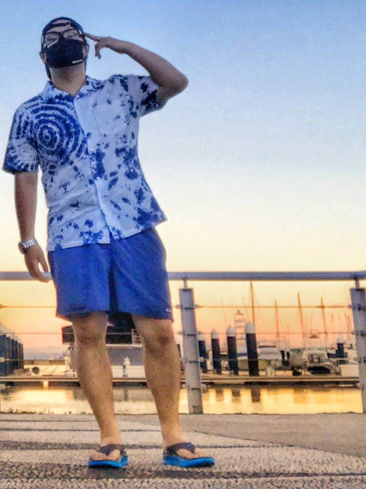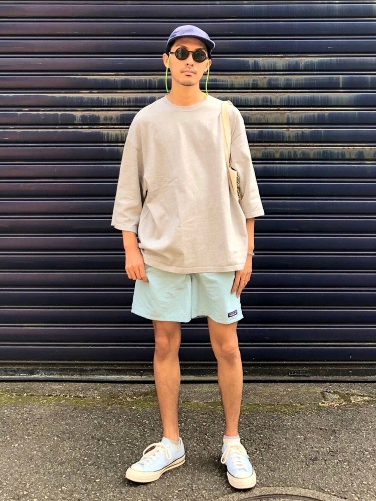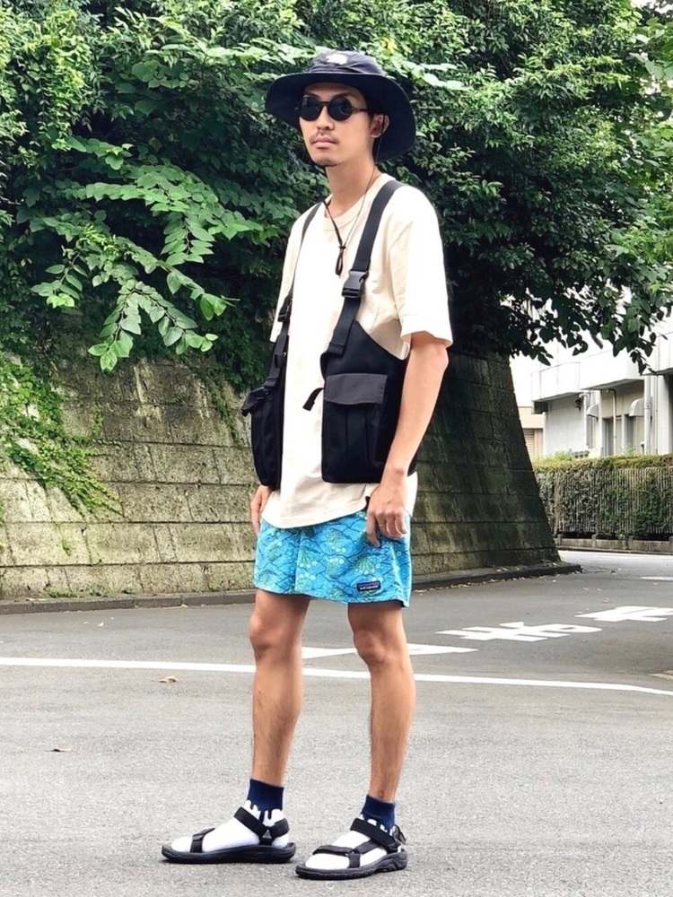 全身を青でまとめたおしゃれ上級者のメンズコーデです。パタゴニアのバギーズショーツを中心に、サンダルとトップスも青系のアイテムでまとめています。夏にぴったりな涼しげな印象を引き出すことができるコーディネート。軽量で動きやすく、ポケットもあるのでアウトドアにおすすめの服装ですよ。
