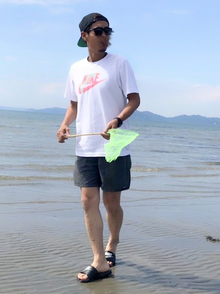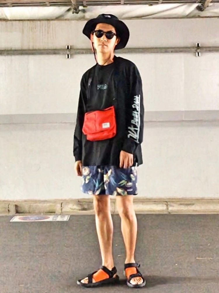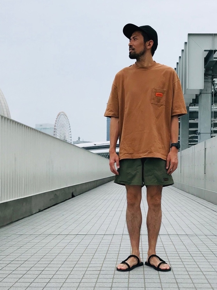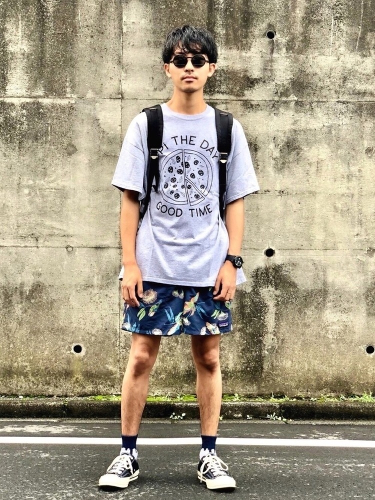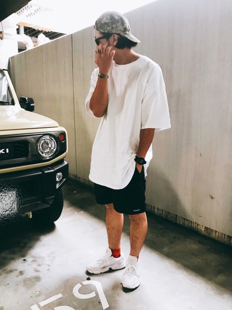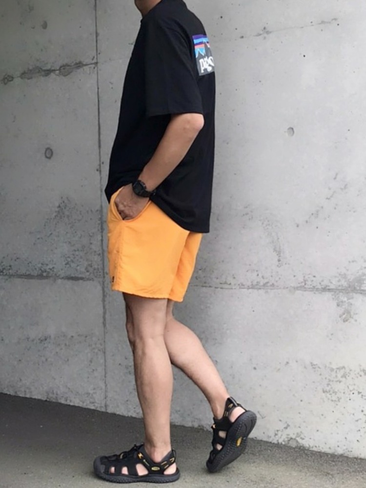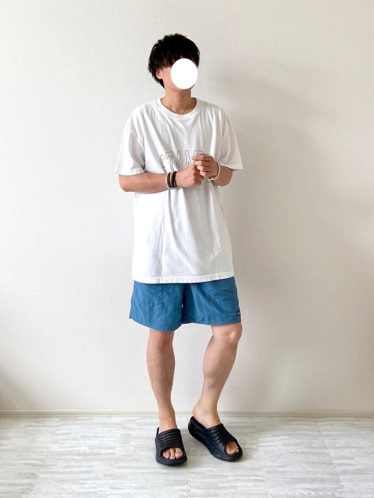 カラータイプのパタゴニアバギーズショーツと、シンプルな白のTシャツは定番のアウトドア向けコーディネートです。若干大きめのトップスを組み合わせることで、全体的なシルエットのバランスを整えています。バギーズショーツにポケットがあるので、アウトドアに最適なメンズコーデ。サンダルは動きやすく、窮屈すぎないアイテムを選びましょう。