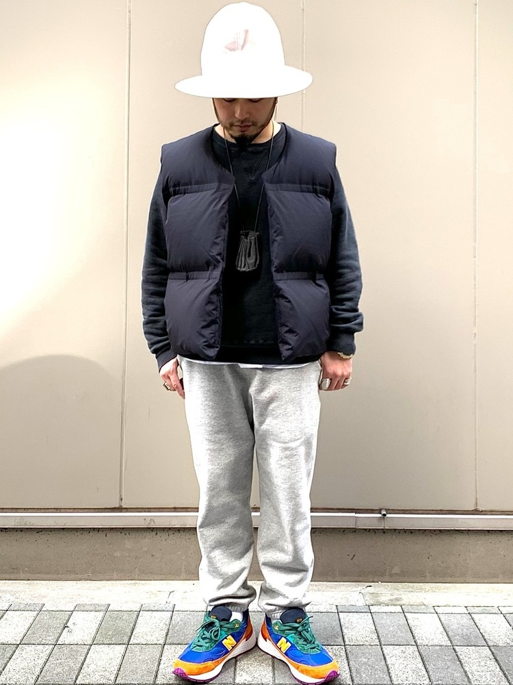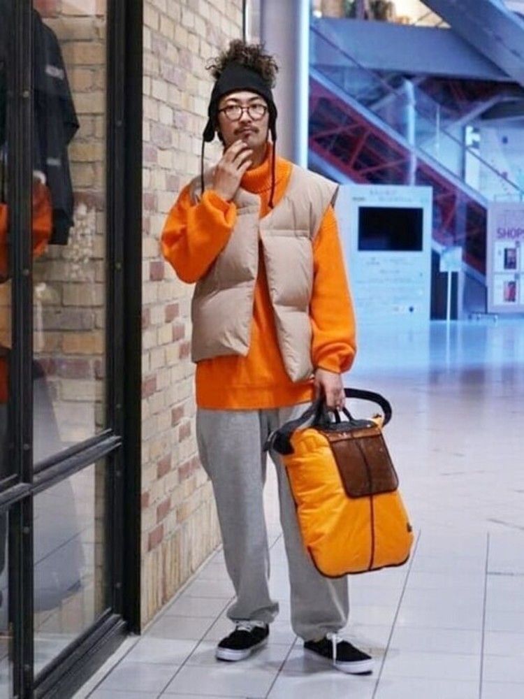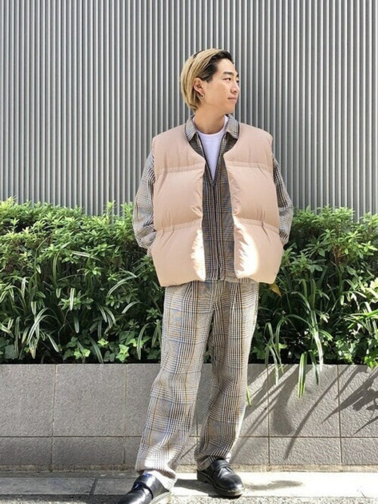 大きなプリントが入ったカットソーとダウンベストの組み合わせです。全体的にシンプルにまとめているのでインナーがアクセントになる素敵なファッションですね。
