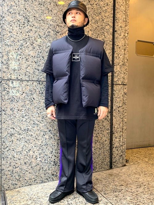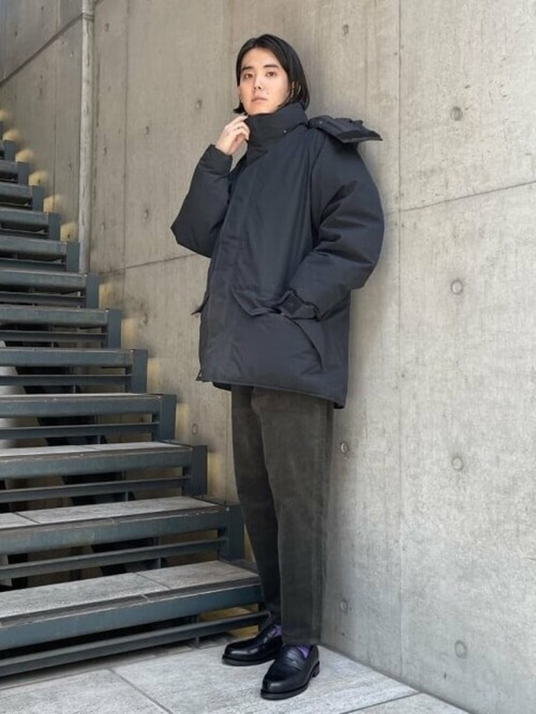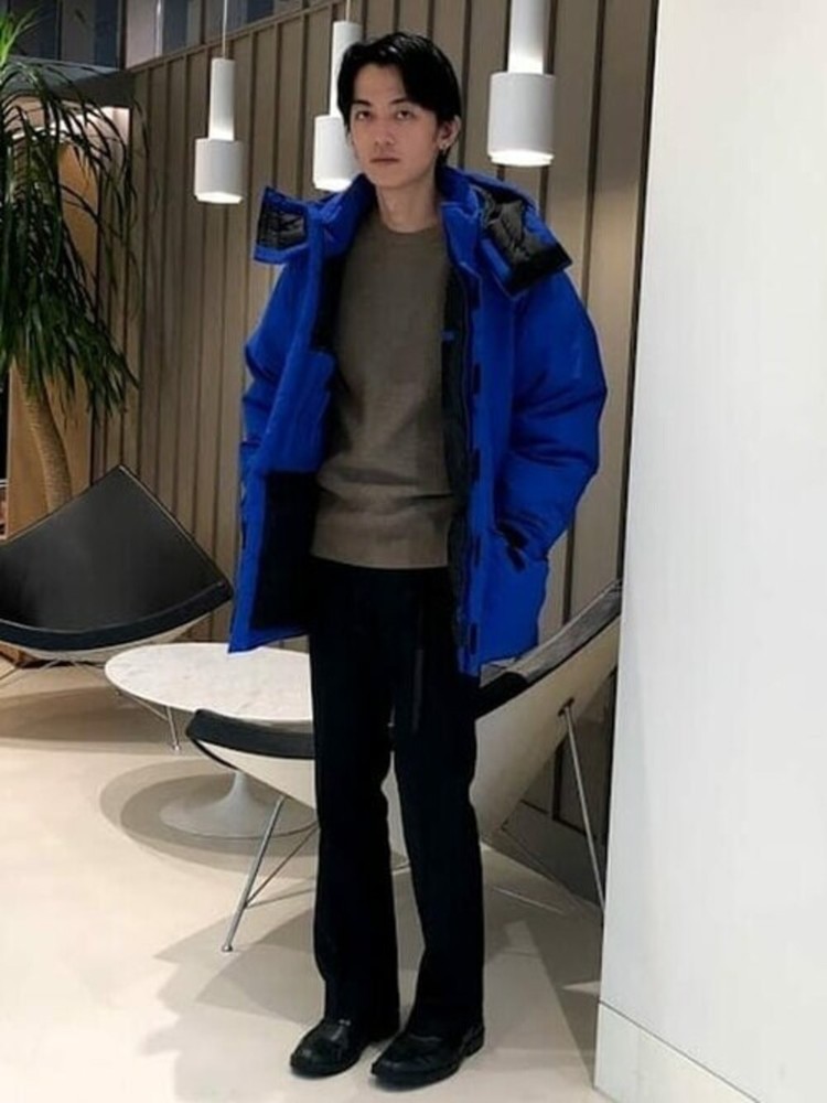 ダウンとクルーネックの組み合わせは最高ですね。上下ブラック系のコーデとブルーのダウンジャケットは色のメリハリが出ておしゃれを楽しめますね。Yラインコーデが映えるサイズの組み合わせですね。