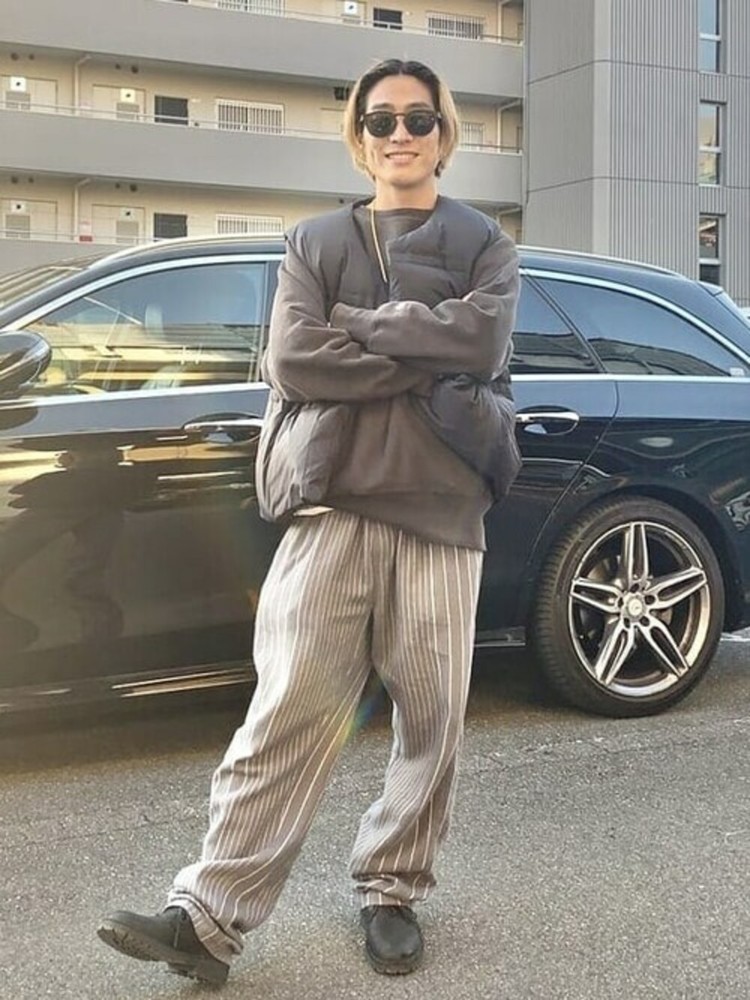 ダウンと反対色のグレーパンツでコーデにメリハリが出ますね。ゆるっとしたサイズのカジュアルファッションに見えますが、ダウンとインナーを同系色でまとめるので全体にメリハリが出るファッションが素敵ですね。