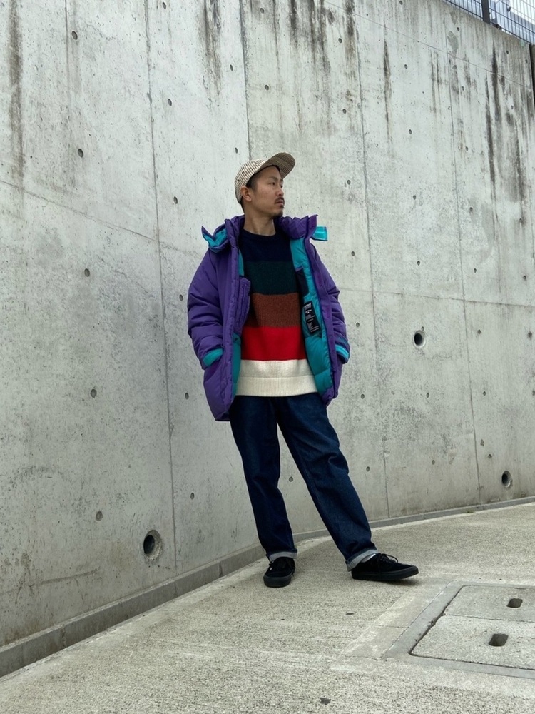おしゃれ上級者の色の組み合わせですね。ビビットカラーのマーモットダウンジャケットもインナーと類似色を使えば綺麗にまとまりますね。