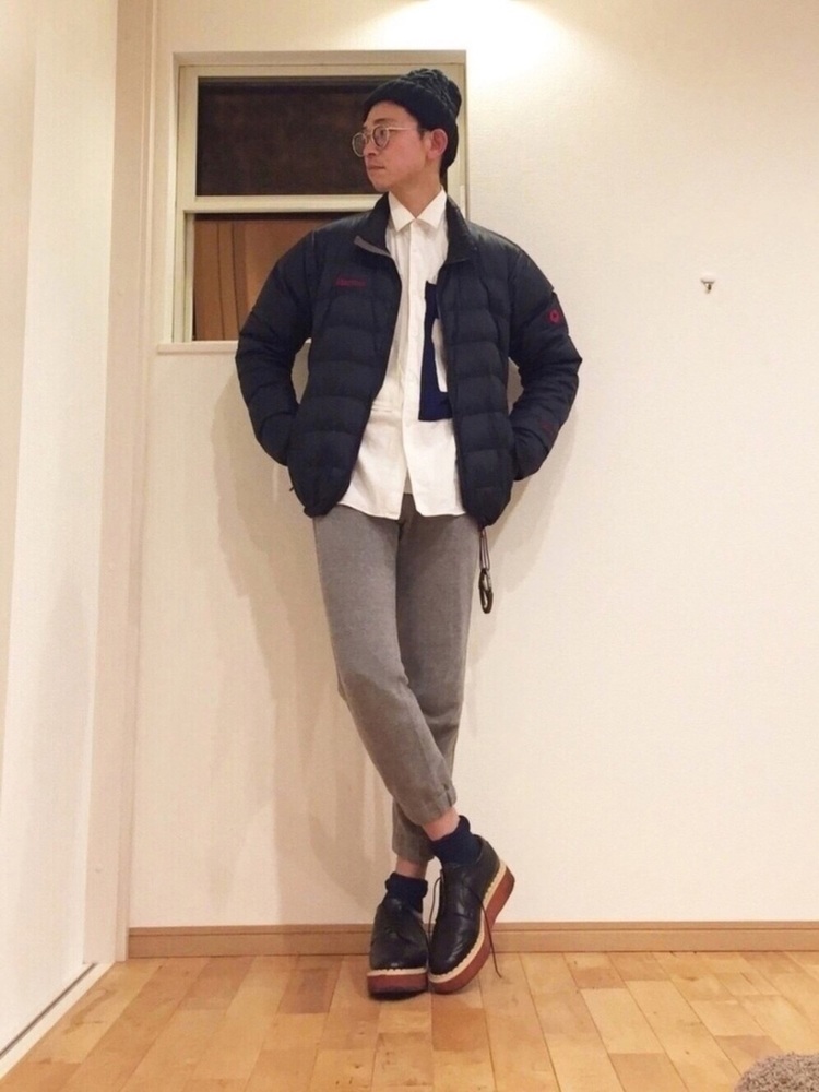シャツで合わせるコーデです。ダウンジャケットはカジュアルに見えがちになりますが非常に綺麗にまとまっていますね。ダウンは通常のシャツやボタンダウンシャツとの相性も抜群です。ライン整えたい方におすすめのサイズ感と組み合わせですね。