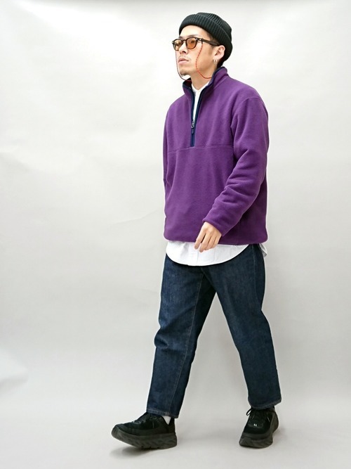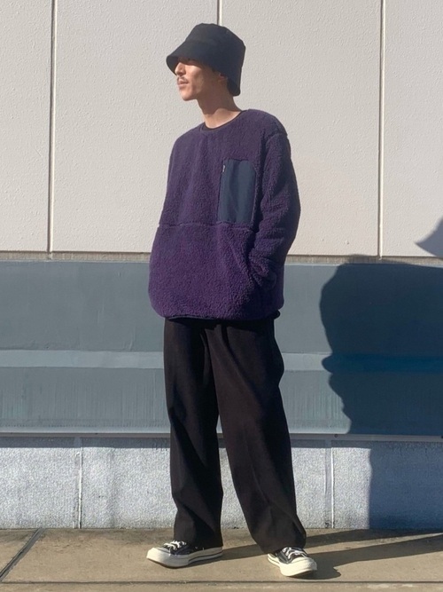 プルオーバーのビッグシルエットフリースを使ったコーデです。ハット、パンツ、シューズを黒でまとめ、フリースにカラーを。色使いが綺麗なメンズコーデです。パープルは明るすぎず派手すぎないので大人っぽくキメるにはこちらのコーデがぴったりでしょう。