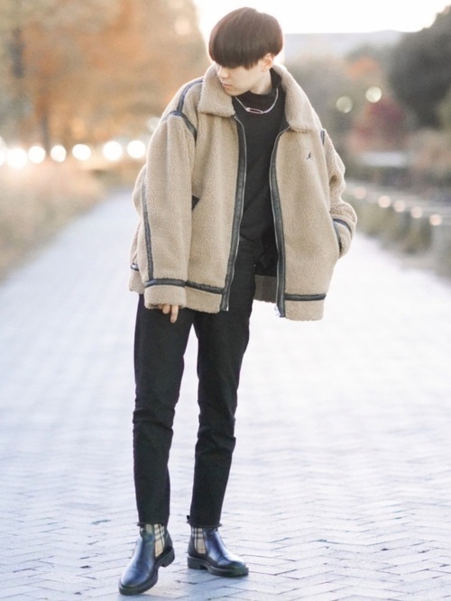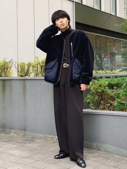 ビッグシルエットのフリースはかなり大きく見えてしまいますが、こちらはカラーでバランスをとったメンズコーデです。ブラックやブラウンを合わせてスタイリッシュで都会的な印象に。インナーにはハイゲージニットもおすすめ。ビッグシルエット×太めパンツのおしゃれ上級者コーデです。