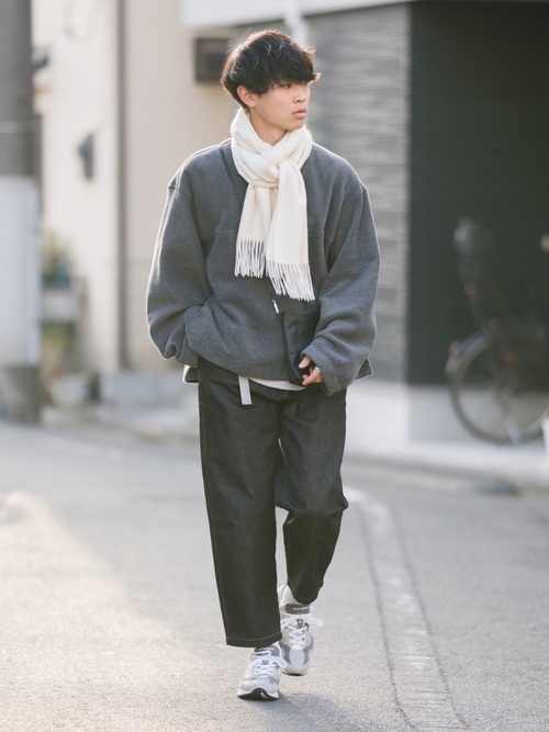 差し色に使える小物アイテムとして便利なのがマフラーやショールです。こちらもマフラーを差し色にしたメンズコーデ。グレーのワントーンコーデだと暗くなりがちですが、白のアイテムを足すことでおしゃれに昇華しています。シューズも同じカラーで全体をしっかりとまとめたメンズコーデです。ざっくりしたニットマフラーをプラスしても良いでしょう。